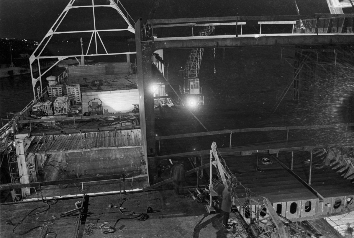 Ekensbergs varv 1970; Transatlantics lastfartyg SCANDIC förlängs i stora dockan; ny sektion lyfts på plats med hjälp av pontonkranen LODBROK.