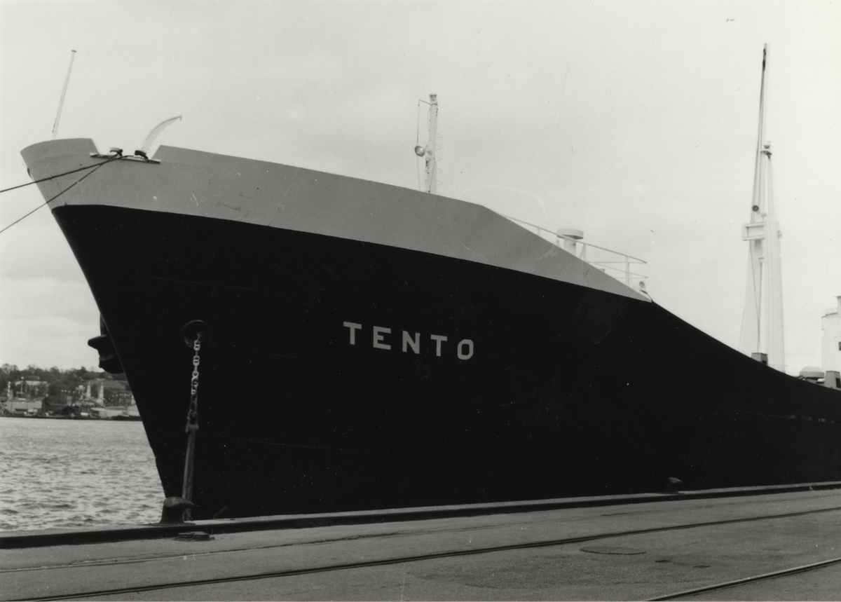 Det tyska lastmotorfartyget TENTO liggande i Stadsgården Stockholm 1970. Foto av förskeppet. Fartyget såldes av Ångfartygs AB Tirfing den 24.10.1969.