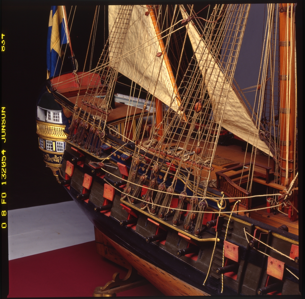 Detalj av modell av 70-kanoners linjeskeppet ENIGHETEN (1732) alternativt GÖTA LEJON (1746).