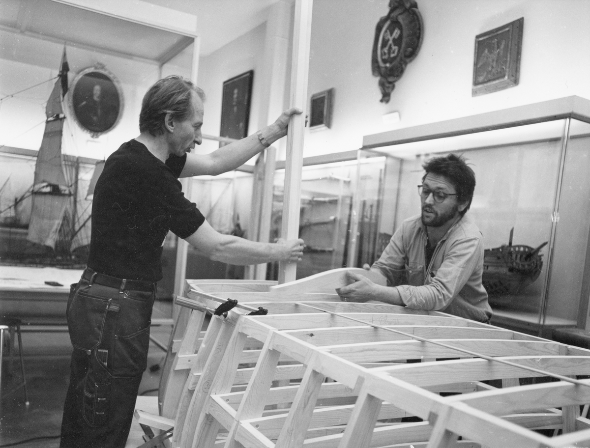 Modellbyggarna Göran Forss (t.v.) och Lars Eriksson i arbete med modellen av Vasa i skala 1:10.