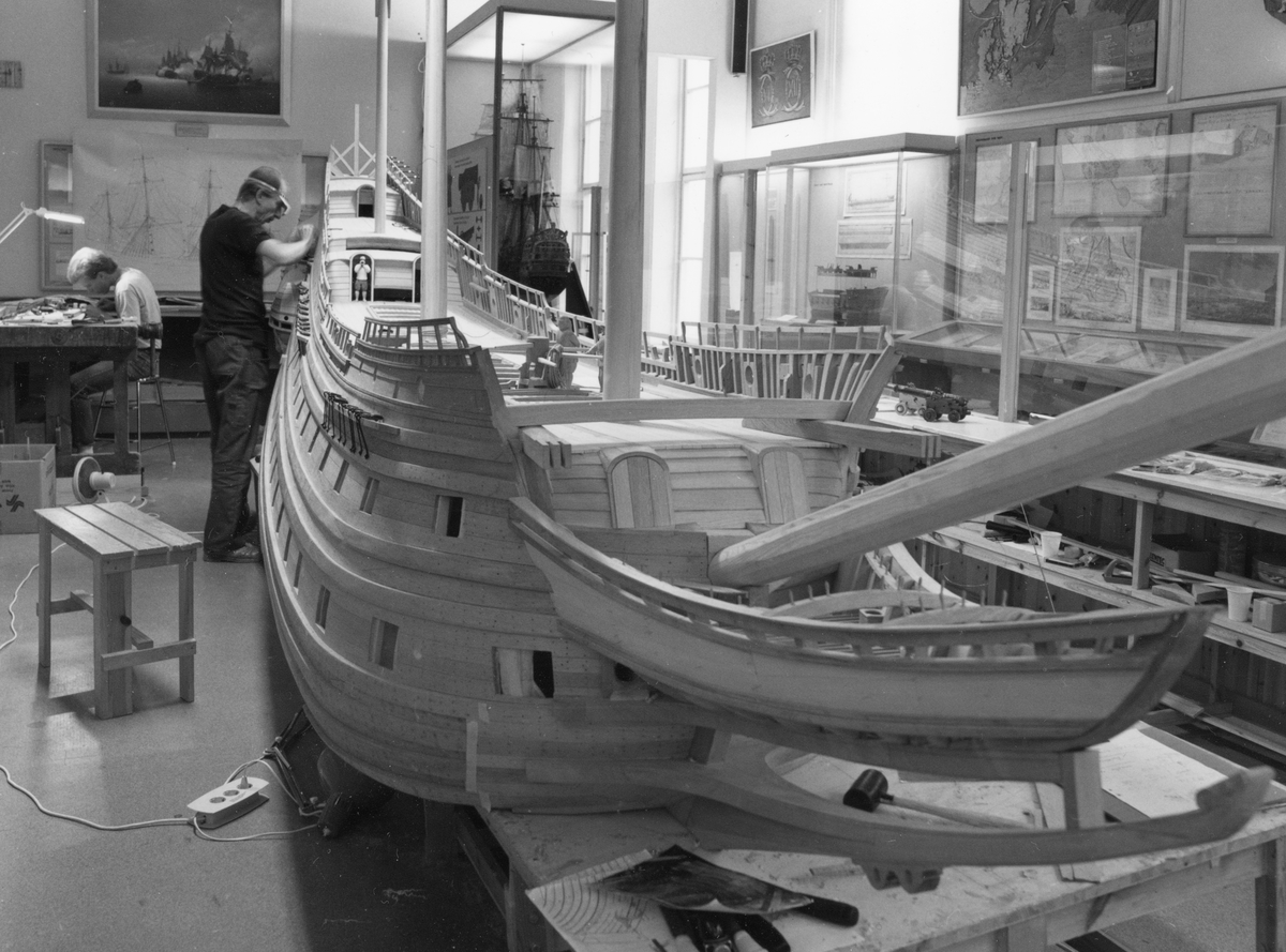 Modellbyggarna Göran Forss och Stefan Bruhn i arbete med modellen av Vasa i skala 1:10.