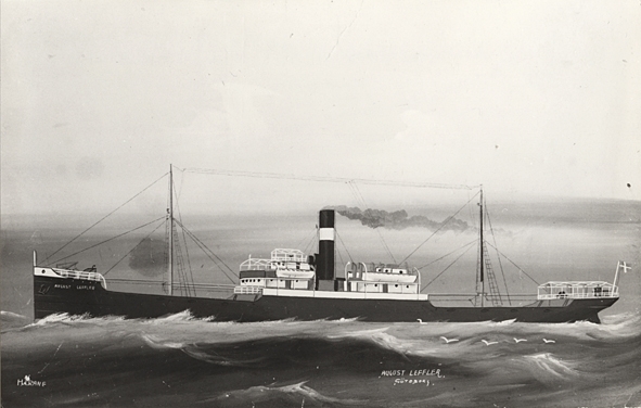 Titel: Akvarell visande babordsidan i dess helhet. Three-island skrov, svart med vit överbyggnad. Svart skorsten med vit ring. Sign. H. Crane