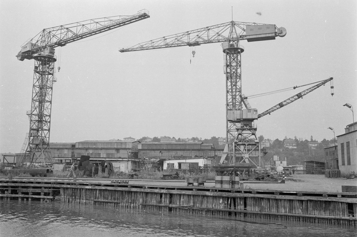 Varvskranar på Ekensbergs varv; vy åt norr med Essingesundet och Stora Essingen i fonden