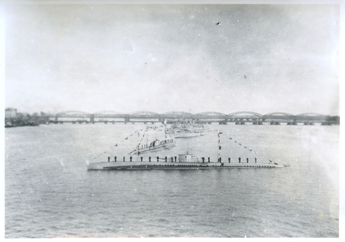 Två litauiska ubåtar (närmast RONIS, bakom SPIDOLA) med flaggspel på floden Daugava i Riga, bakom dem bl. a. en minsvepare. I bakgrunden järnsvägsbron i Riga.