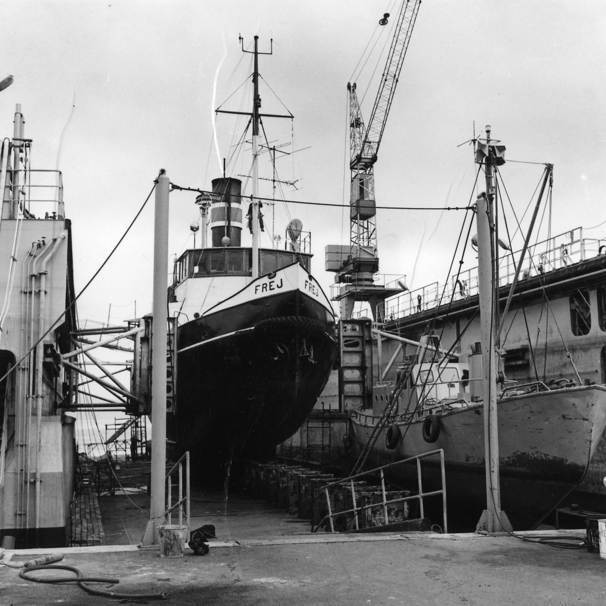 Bogserbåten FREJ från Köpmanholmen i flytdockan vid varvet.
