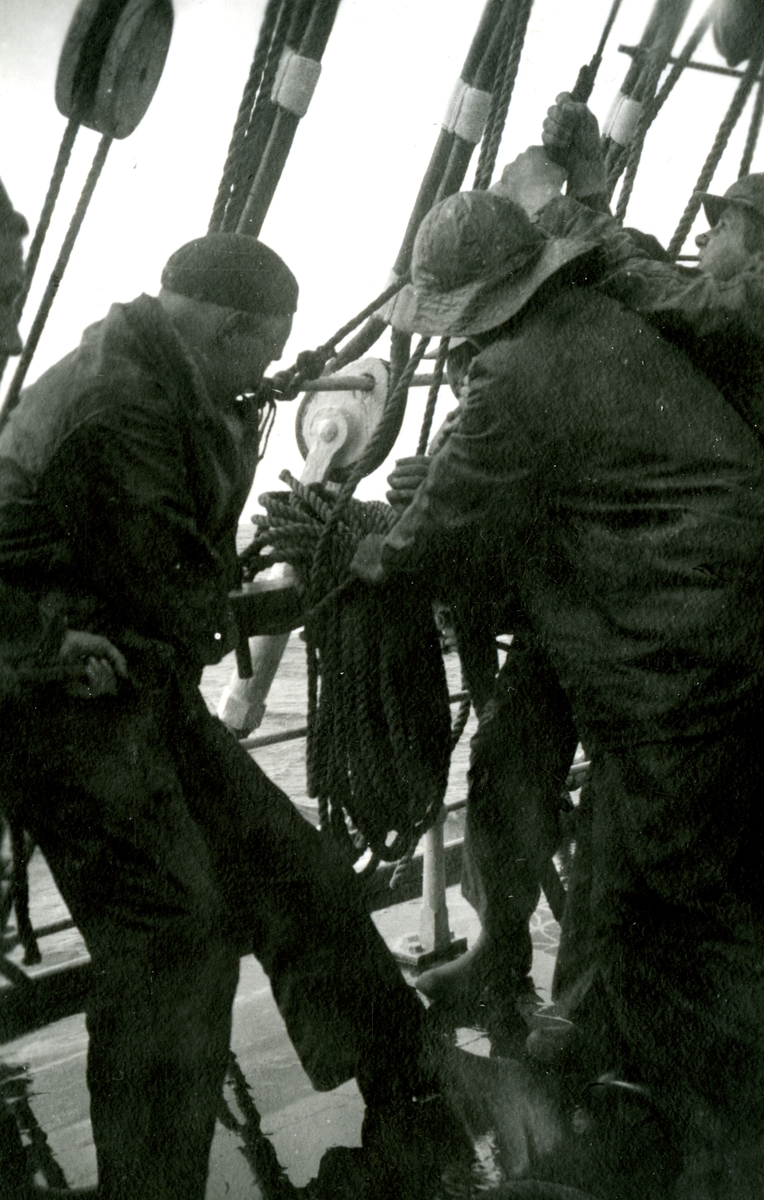 [från fotobeskrivningen:] [---] "Bilder frå[n] resor med skolskeppet (4-mast. barkskepp[et) ABRAHAM RYDBERG III åren 1932-1935."; [---]; "3. I gigtågen"; [under rubriken Fotograf:] "Jacobsen, B. styrman Stockholm 1932-35"