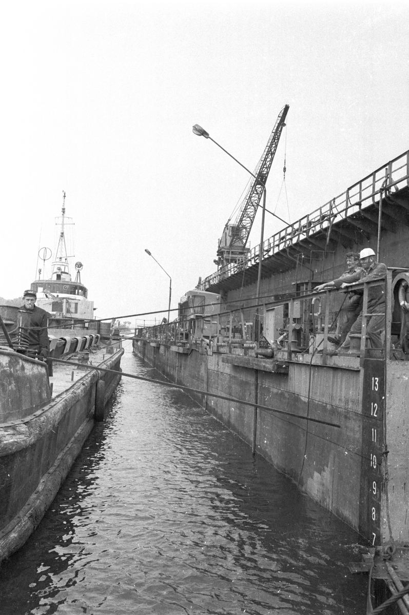 Ekensbergs varv 1970; i flytdockan oidentifierad pråm, i bakgrunden bogserbåten GARPEN (1954)