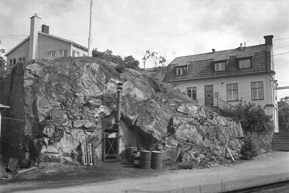 Ekensbergs varv 1970; skyddsrum insprängt i berget; till h varvskontoret,som tidigare varit Ekensbergs värdshus. Ovanför skyddsrummet skymtar gaveln på ritkontoret.