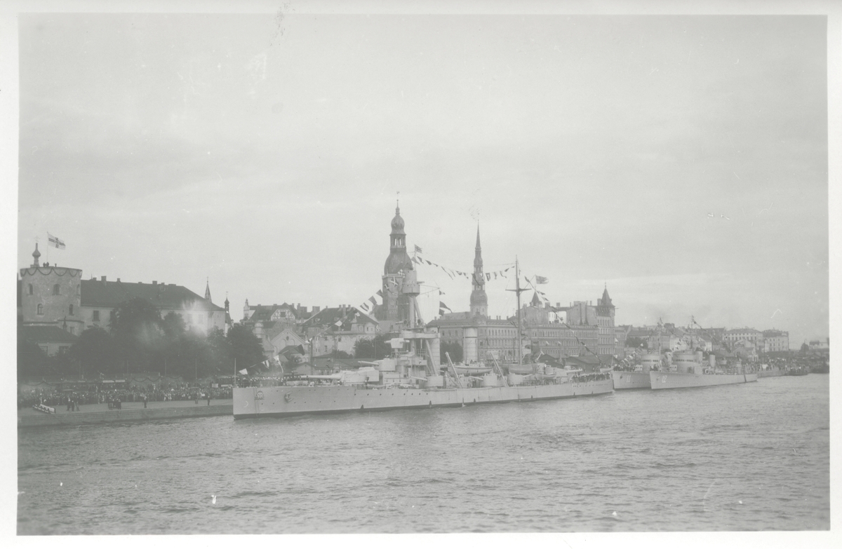 Pansarskeppet DROTTNING VICTORIA samt jagarna EHRENSKÖLD och NORDENSKJÖLD vid kaj i Riga. På kajkanten en stor folksamling. Bilden har uppenbarligen tagits i samband med Gustaf V:s statsbesök i Riga i juni 1929. Se även Fo229138 och Fo229417A.