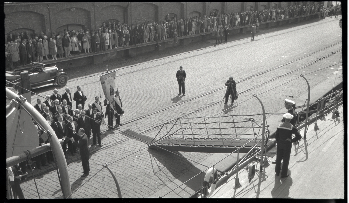 Kung Gustaf V (skymd vid landgången) gör sig beredd att gå i land från pansarskeppet SVERIGE vid sitt statsbesök i Tallinn 27 juli 1929.