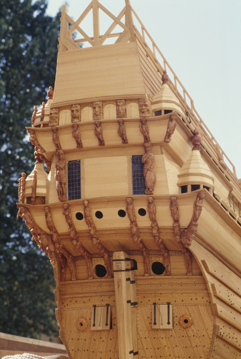 Vasamodellen i skala 1:10 flyttas in i Vasamuseet. Akterspegeln.