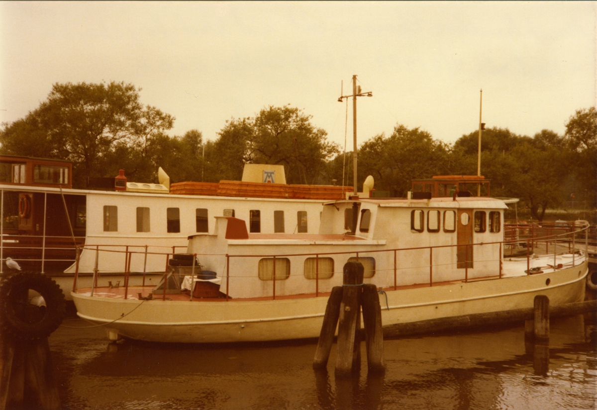 Musikhandlare Ekmans båt vid Stadsfärjekajen i Västerås 4/9 1979. I bakgrunden Elba.