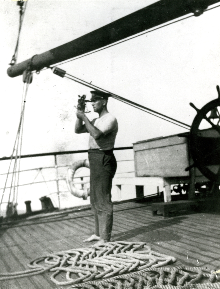 [kommendör Sjödahls egna ord om bilden, återgivna i fotobeskrivningen:] [---] "Världsomsegling 1928-1929. Stiltje. Trots skepparens flit vid sextant blev inte några mil per dygn." [---]
