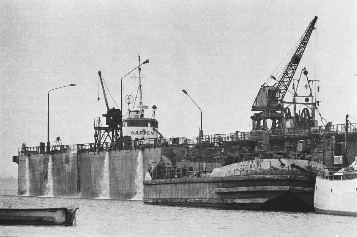 Ekensbergs varv 1970; i lilla dockan repareras bogserbåten GARPEN (1954); i förgrunden ses Skånska Cementgjuteriets pråm SCG No.11. Längst t h ses skorstenen på varvets bogserbåt EKENSBERG.