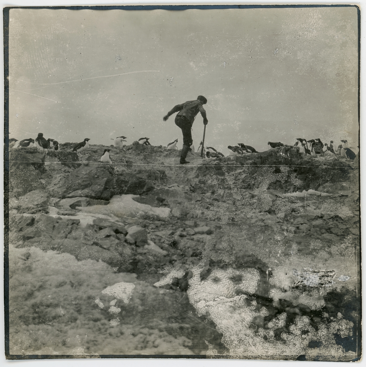 Letande efter Otto Nordenskjölds två efterlämnade trälådor med fossiler bland pingviner i Hope Bay. 5 december 1903.