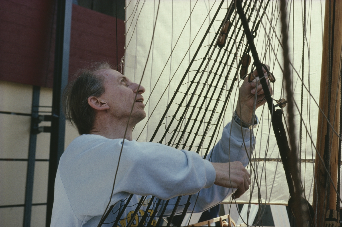 Modellkonservator Göran Forss justerar riggen på modellen av Vasa i skala 1:10.