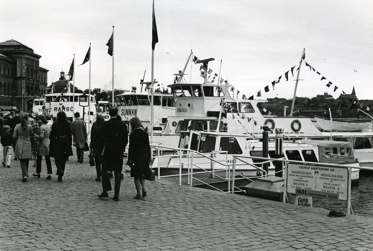 Hamnbild från Strömkajen i Sthlm. Foto 4.6 1969. Fartyg från v. m/s Tynningö, m/s Ramsö, m/s Havsörnen, m/s Sunnan, m/s Rödlöga, m/s Rånö.