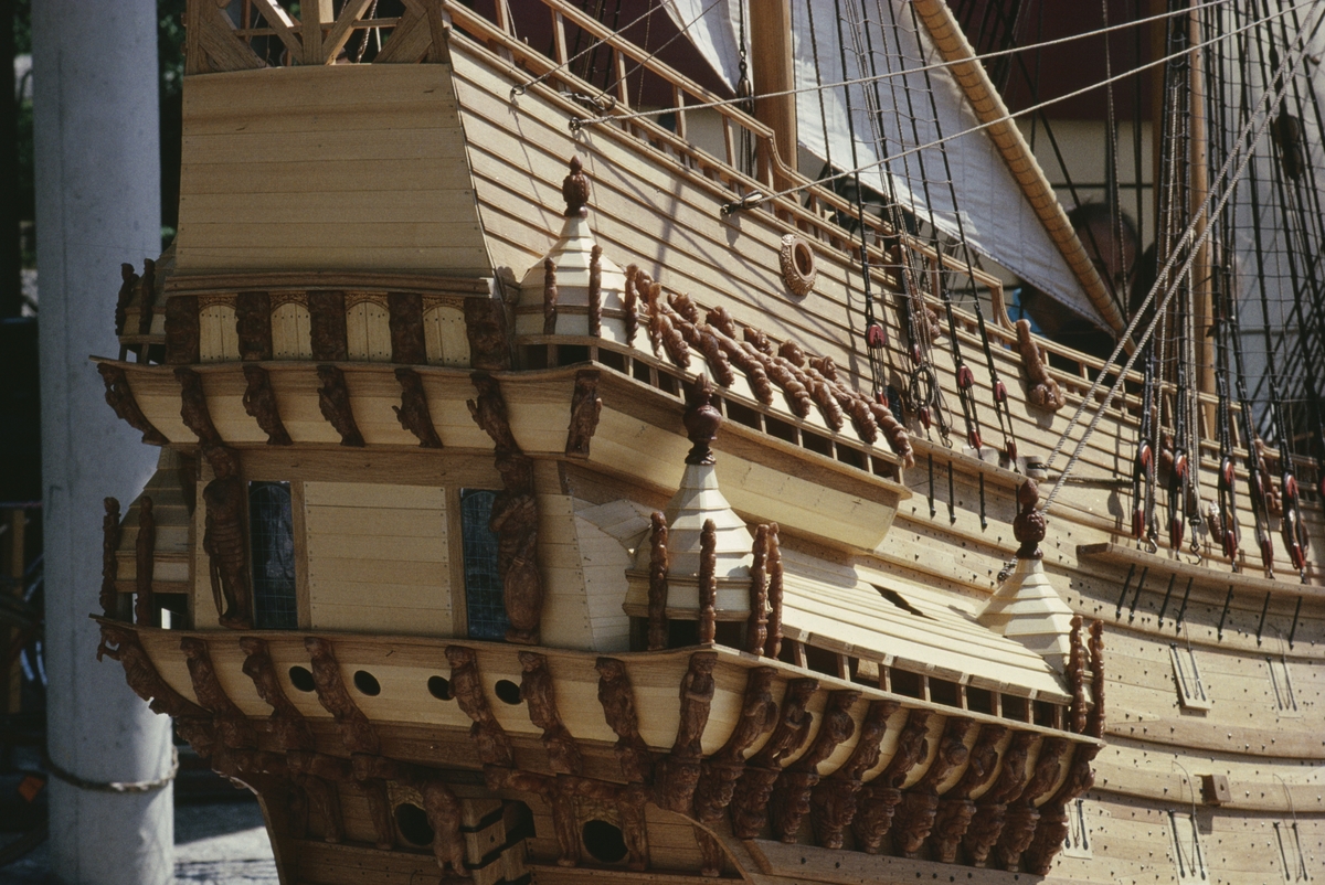 Vasamodellen i skala 1:10 utanför Vasamuseet. Akterspegel och styrbords låringsgallerier.