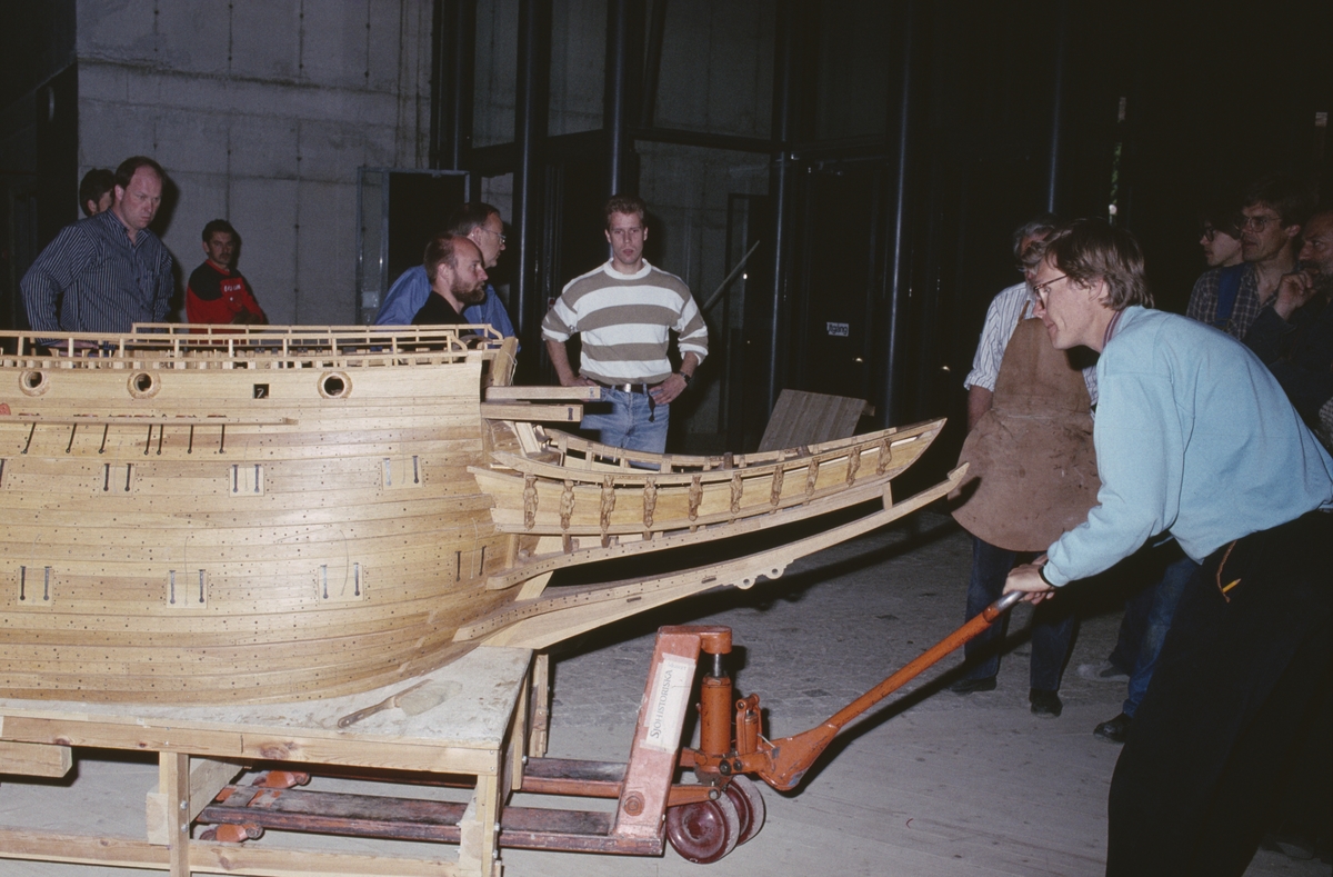 Vasa-modellen i skala 1:10 flyttas in i Vasamuseet. I bakgrunden bl.a. Carl-Gunnar Olsson och Stefan Bruhn.