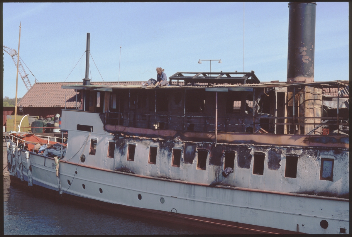 Titel: S/S Mariefred vid kaj efter branden i maj 1994. Beckholmen, Stockholm