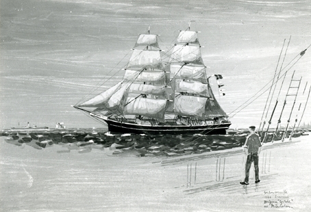 Akvarell av gordon McFie föreställandebriggen gerda av Pataholm i öresund. Akvarellen signerad 1926