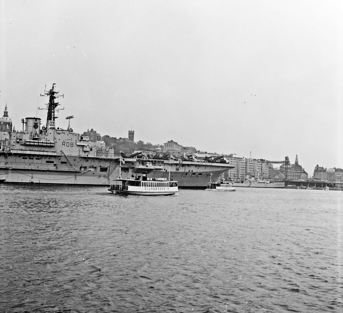 DJURGÅRDEN 5 och DJURGÅRDEN 6 på Stockholms ström. I bakgrunden: hangarfartyget HMS BULWARK (R08), fregatten HMS ANDROMEDA (F57).