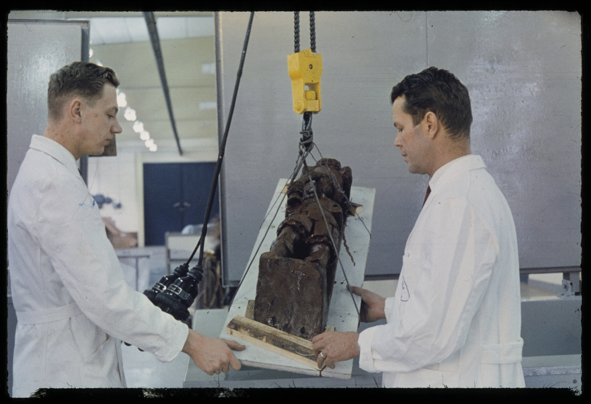Nedläggning av skulptur i bad av Bo Lundvall (till vänster) och Lars Barkman (till höger) i konserveringsanläggningen på Beckholmen.