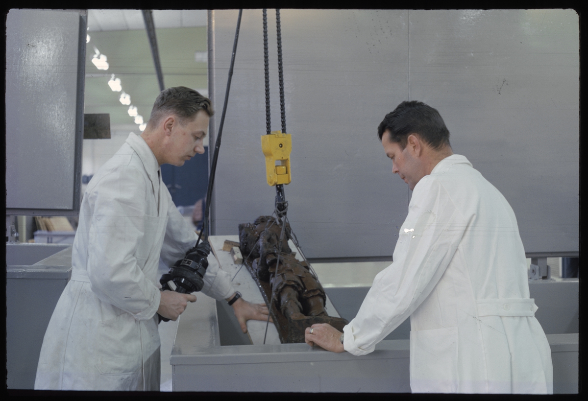 Bo Lundvall (till vänster) och Lars Barkman (till höger) lägger ned en skulptur i konserveringskar på, konserveringsanläggningen på Beckholmen.