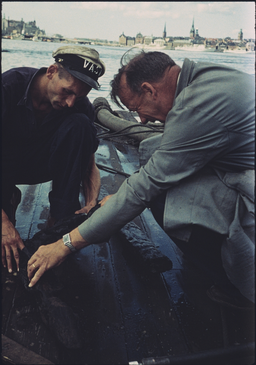 Bärgningsledare Edward Clason och dykare Lennart Carlbom synar ett nyss bärgat föremål ombord på dykarflotten.