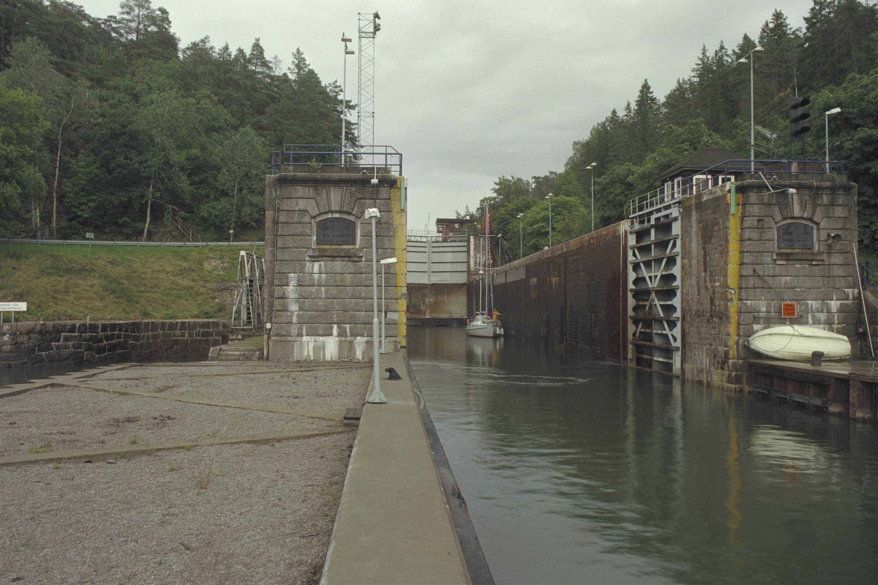 Sista porten innan man kommer in i Göta älv. Nedre slussen i 1916-års slussled. Används än idag för trafik. (2010)