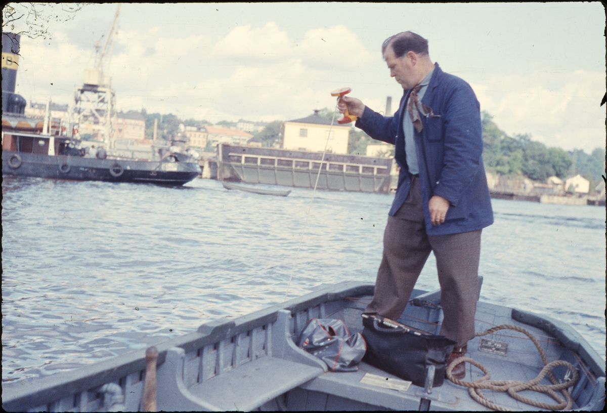 Dykarbasen Per Edvin Fälting lodar djupet.