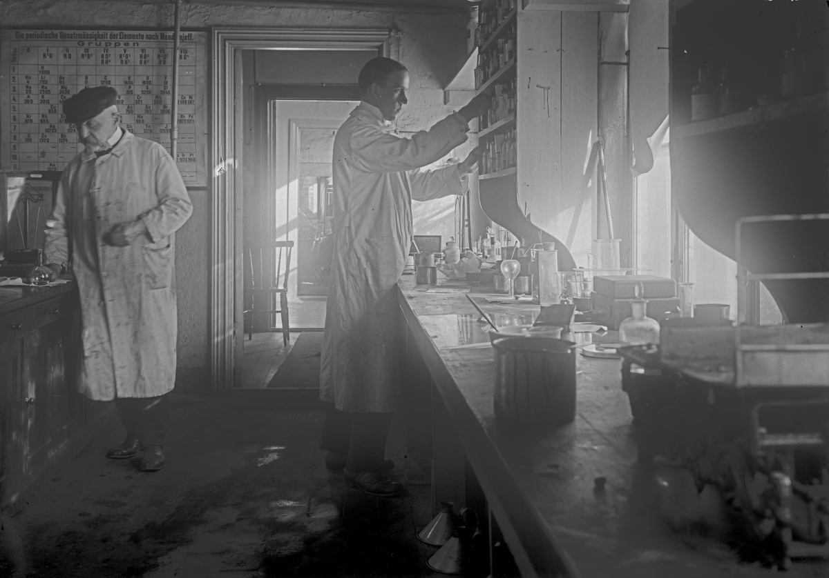 Färgfabriken Standard. Interiör. Laboratorieliknande rum. Två men i vita rockar.