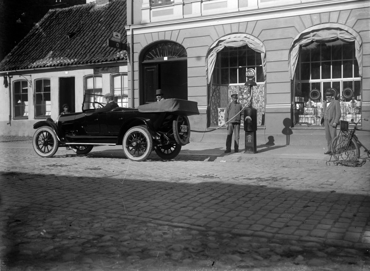 Gatubilder. Asks färg, bensinpunp framför, en bil och fyra karlar.