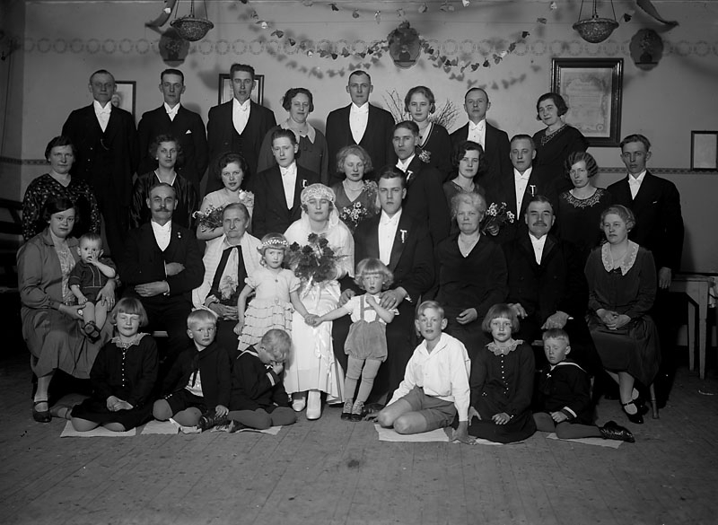 Gruppbild brudpar med bröllopsgäster ”Vykort”