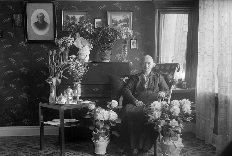 Fiskare Karlsson, man omgiven av blommor uppvaktning i hemmet