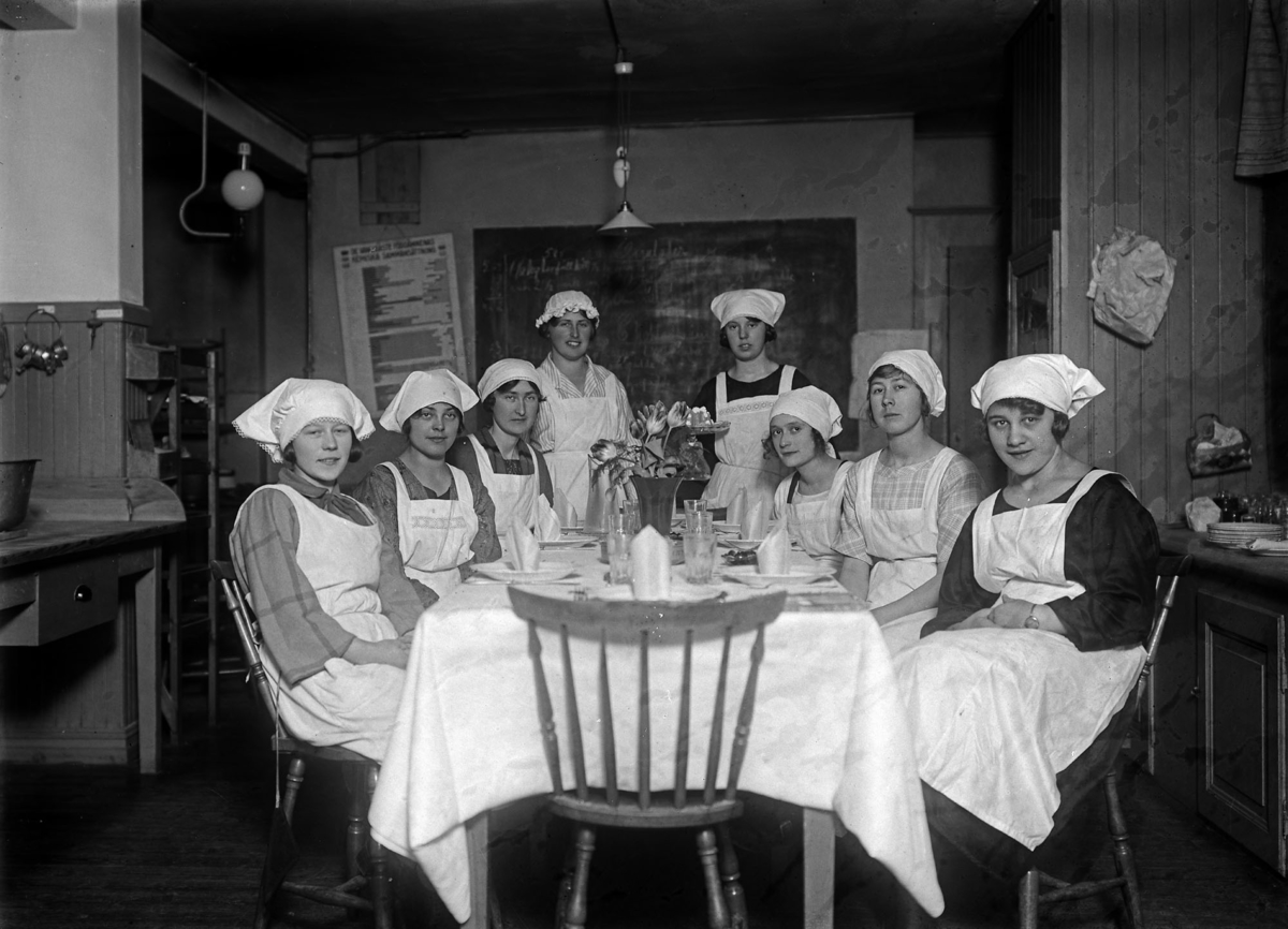 7 elever i en kökskola med sin lärare, avslutningsfest.