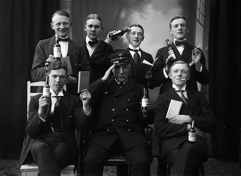 Sju män med spritflaskor, cigarrer (och motböcker?), 1918