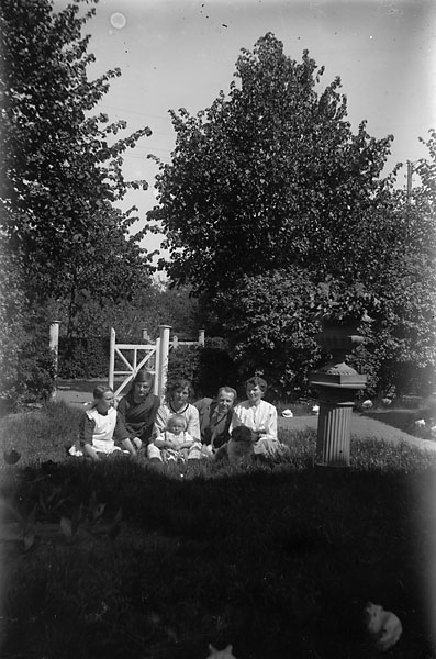 Fem vuxna och ett barn sittande i gräset i en trädgård, Johnssons privata bilder