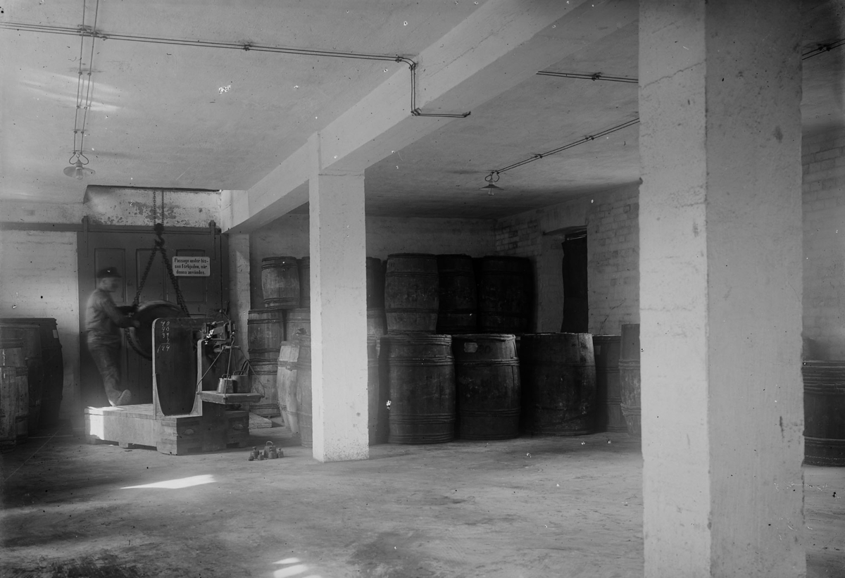 Färgfabriken Standard. Interiör. Färgtunnor i lagerutrymme, men manövrerar en travers eller liknande.