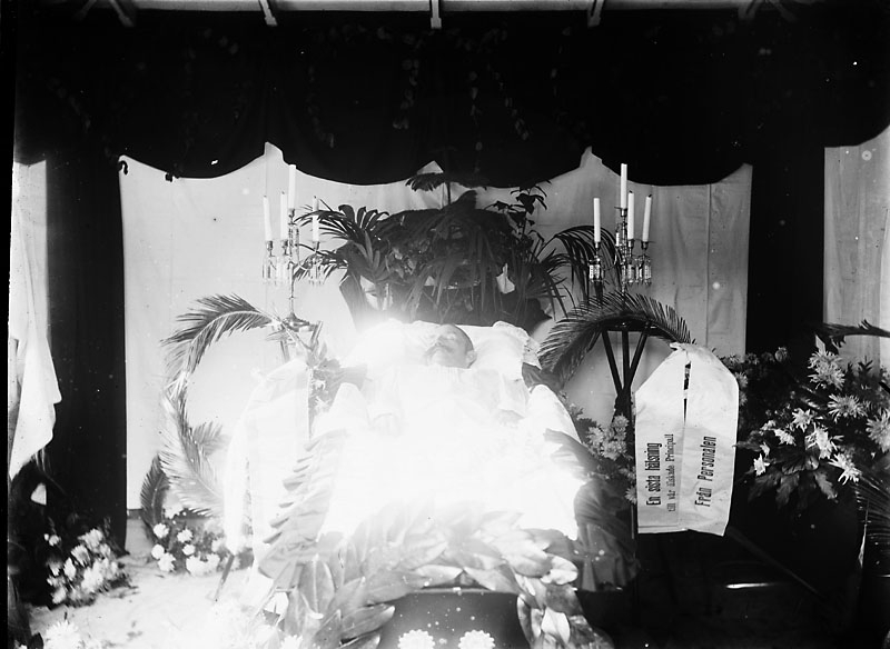 Död man på lit de parade i hemmet. "En sista hälsning till vår älskade principal från personalen".