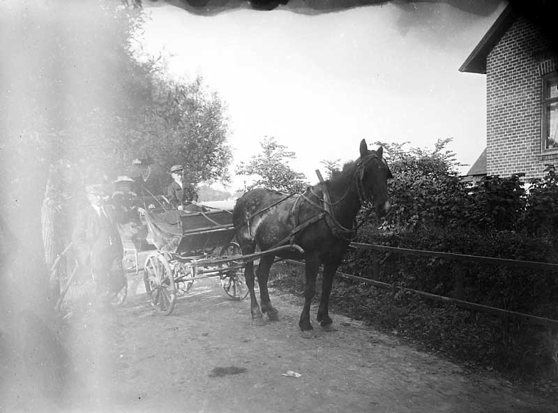 Vagn dragen av en häst. Familj, 2 vuxna och 2 barn.