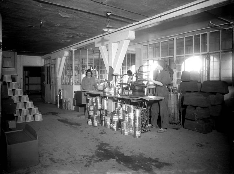 Nilssons barnvagnsteknik, Interiör, industri. Kvinnliga arbetare. Malmö Parkgatan i Malmö? Har senare byt namn till A.G. Nilssons barnvagnfabrik?
