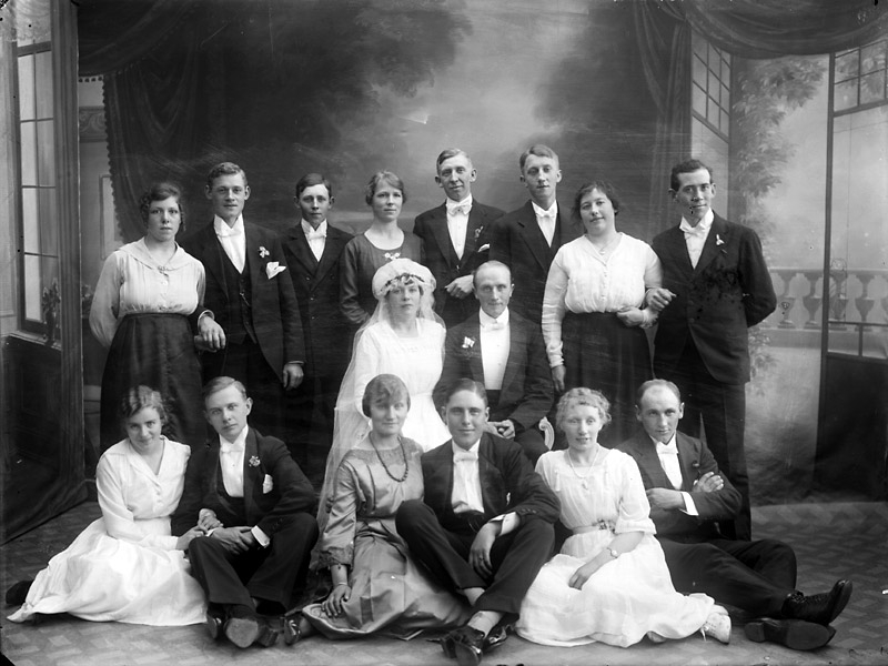 Bröllopssällskap i fotoateljé. Brudpar med anhöriga. Ateljebild.