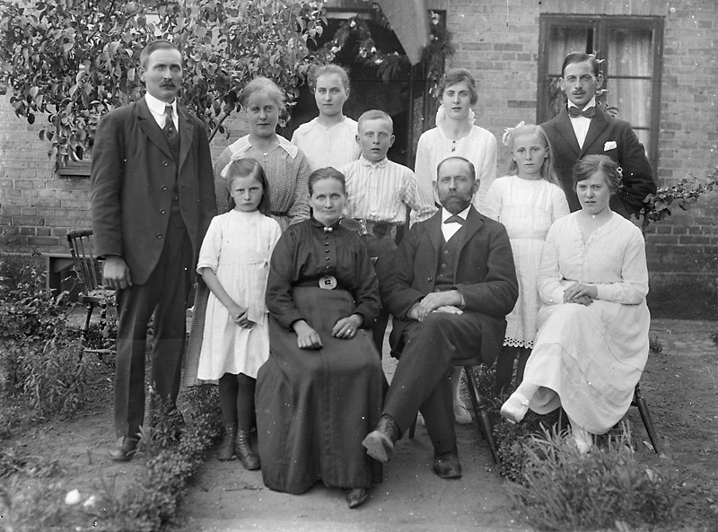 Titel: Okänd familj framför ett hus. Över dörren hänger en flagga.