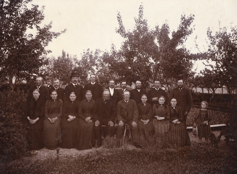 Gruppfoto mitt i en trädgård, taget på landet, fruktträd i bakgrunden, foto:L H Borgström Trelleborg Svedala.