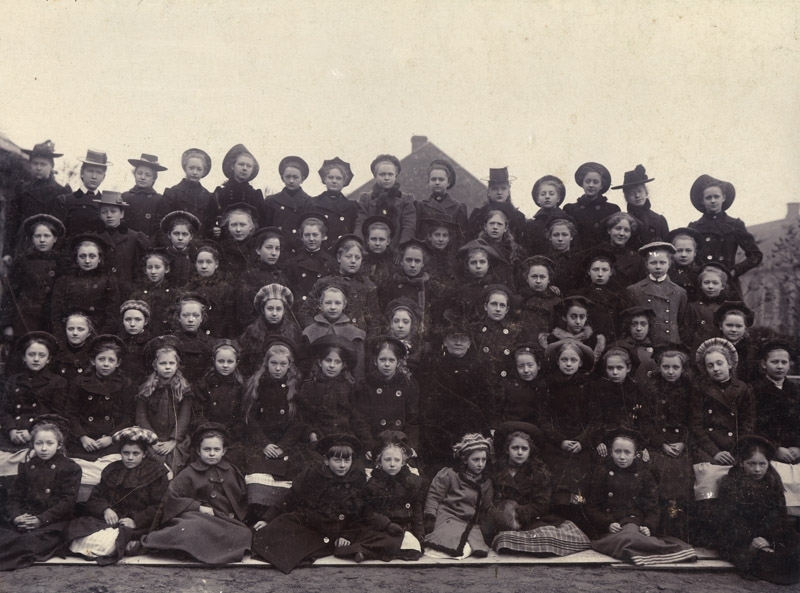 Fröken Charlotte Jönssons flickskola Trelleborg år 1901 eller 1907, översta raden från vänster, 1 Jenny Pettersson, 2 Anna Hallonsten, 3 Elin Möller, 4 Lisa Strömberg, 5 Signe Pettersson, 6 Elsa Stickler, 7 Alexandra Fris, 8 Hedvig Smith, 9 Elin Rasmusson, 10 Beda Hallonsten, 11 Rut Nosslin, 12 Elisabeth Mellin, 13 Anna Berggren, 14 Anna Möller, andra raden från vänster, Andrea Andersson, 2 Torgund Östergren, 3, 4 Mia Bolmstedt, 5 Mathilda Jönsson (Malin), 6 Helfrid Lidner, 7 Ella Palmkvist, 8 Mia Gren, 9 Agnes Andersson, 10 Mathilda Sjölin, tredje raden från vänster, 1?, 2 Mathilda Persson, 3 Inga Hedström, 4 Ida Ekelund, 5 Elisabeth Tell, 6 Laura Nilsson, 7 Hanna Andersson, 8 Blenda Larsson(Wemmerlöf), 9 Anna Persson Fuglie, 10 Ludvig Jönsson Fuglie, 11 Ebba Andersson, 12 Hermina Persson, fjärde raden från vänster, 1 Hanna Trulsson, 2 Hilda Johansson, 3 Emy Persson, 4 Edit Månsson, 5 Lill Müller, 6 Dorothy Ponton, 7 Anna G Andersson, 8 Fredrika Rosenfelt, 9 Olga Persson-Giström, 10 Emma Borgström, femte raden från vänster, 1 Ragnhild Magnusson, 2 Signe Christensson, Wally Granbom, 4 Hildegard Fris, 5 Signe Granbom, 6 ?, 7 Mia Granbom, 8 fröken ?, 9 Elsa Haeger, 10 Lotta Smith, 11 Agda Olsson, 12 Frida Persson, 13 ? Mellander, 14 Helga Jepsson, nedre raden från vänster, 1 Ester Karlmark, 2 Gudrun Götherström, 3 Mia Germundsson, 4 Olga Gjörloff, 5 Greta Mattsson, 6 Lily Stickler?, 7 Elly Mattsson, 8 Greta Hedström, 9 Therese Holmgren, 3088/79, Enligt fsk. N Sigfrid Jeppsson, vars syster är med på kortet, ? måste kortet ha tagits omkring 1900 sannolikt 1901, OBS Olga ?, foto: Rudolf Pettersson Höganäs&Ljungbyhed