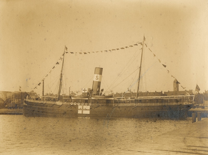 Passagerarfartyg vid kaj, S på skorstenen, vattentornet till höger i bakgrunden.