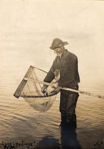 Räkfångst med håv i Lilla Beddinge, Fiskaren Jöns Hansson å nummer 21 vittjar håven 1918, 9539, foto: CN.
