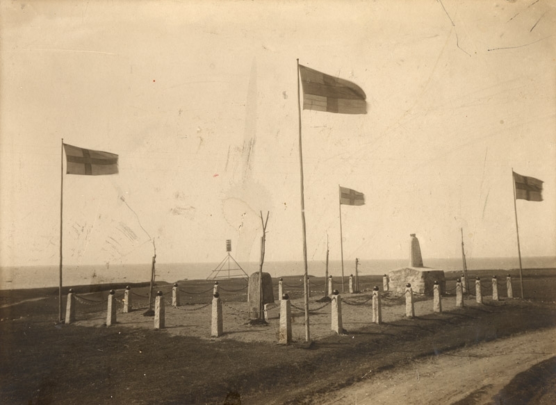 Stavstensmonumentet med 4 flaggstänger , nyplanterade träd.