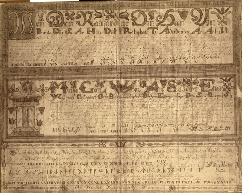 Södra Åby, 1828, Mätta MårtensDotter, Ohla Ericksson,, stilprover, bibelord, 108cm bred? Gl, ppr, 6.